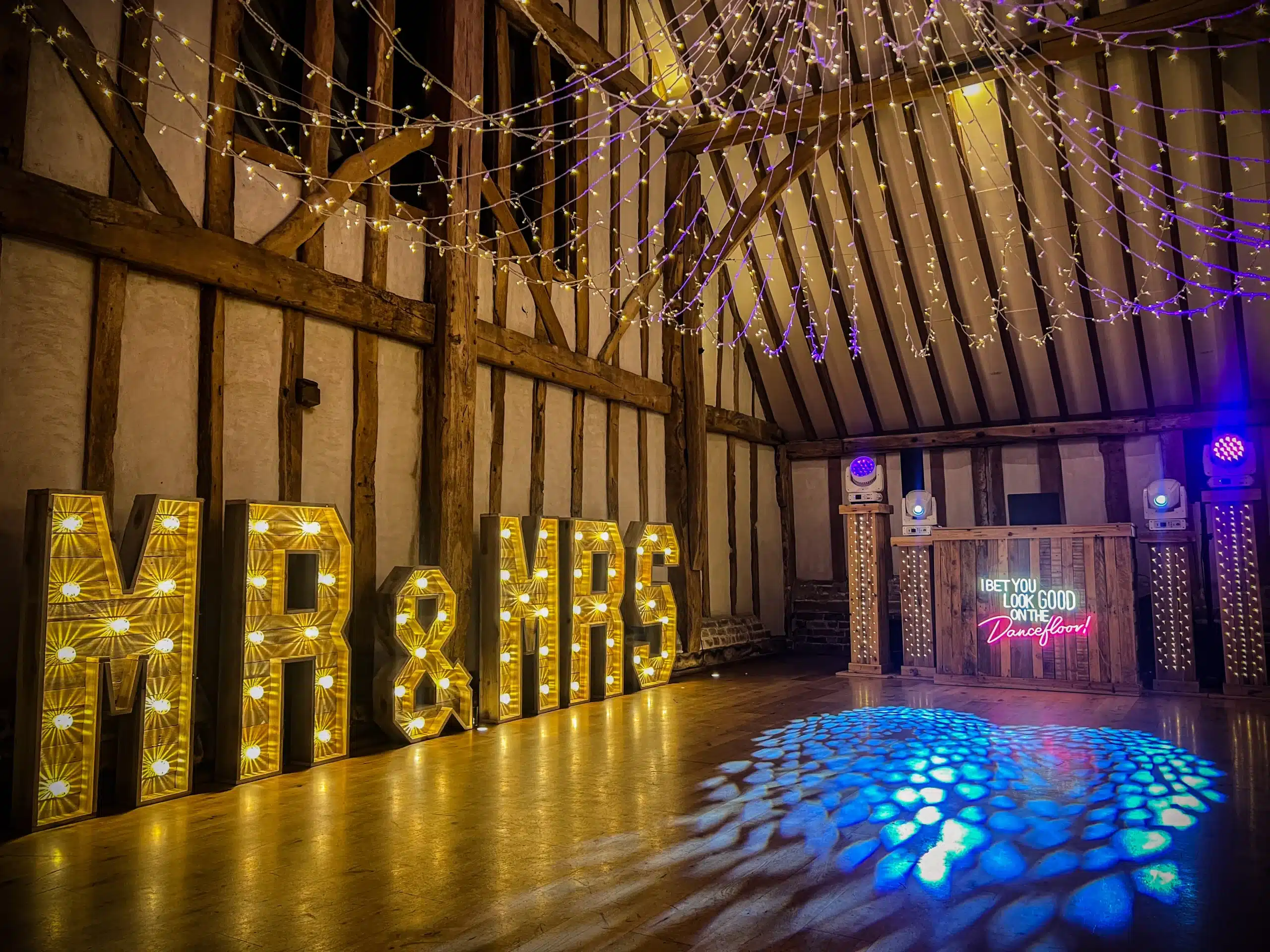 Add a charming and rustic statement to your wedding with our 4ft tall Rustic ‘Mr & Mrs’ Letters. Perfect for creating a stylish focal point at your venue, these letters are ideal for the first dance, wedding photos, and as a decorative highlight throughout the celebration. Available to hire for £200, the Rustic ‘Mr & Mrs’ Letters bring a warm, photogenic, and memorable touch to weddings across Essex and Suffolk, enhancing both rustic and barn-style settings.